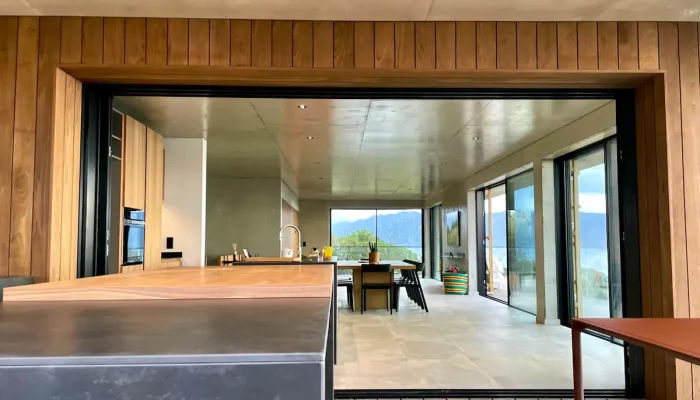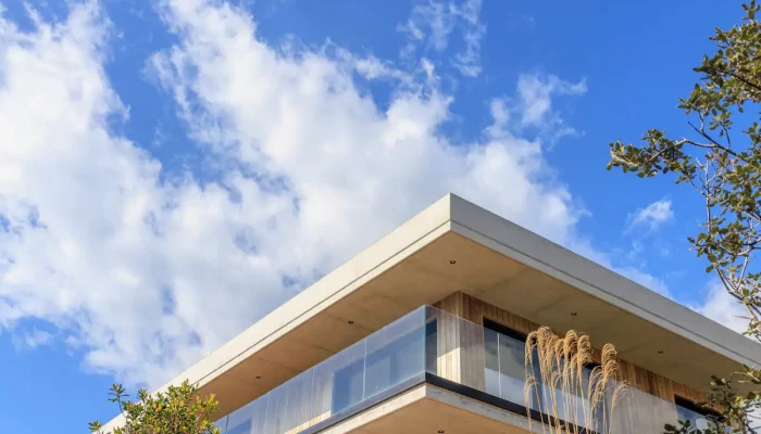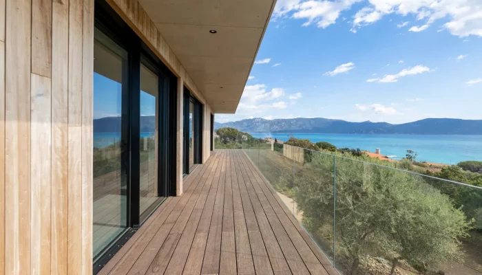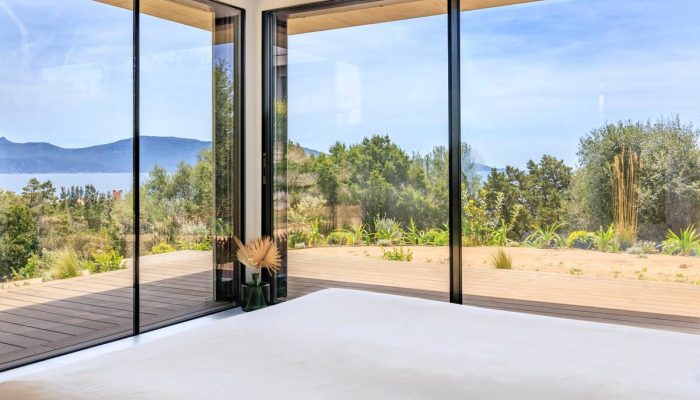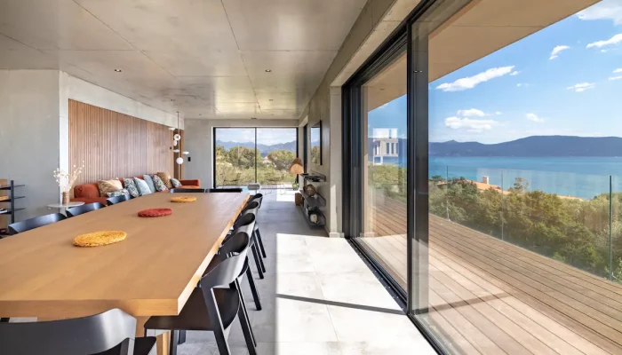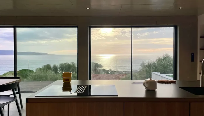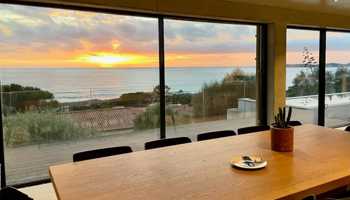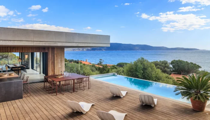 La plage se trouve à quelques minutes à pied tandis que la piscine à débordement est chauffée à l’aide de panneaux solaire.